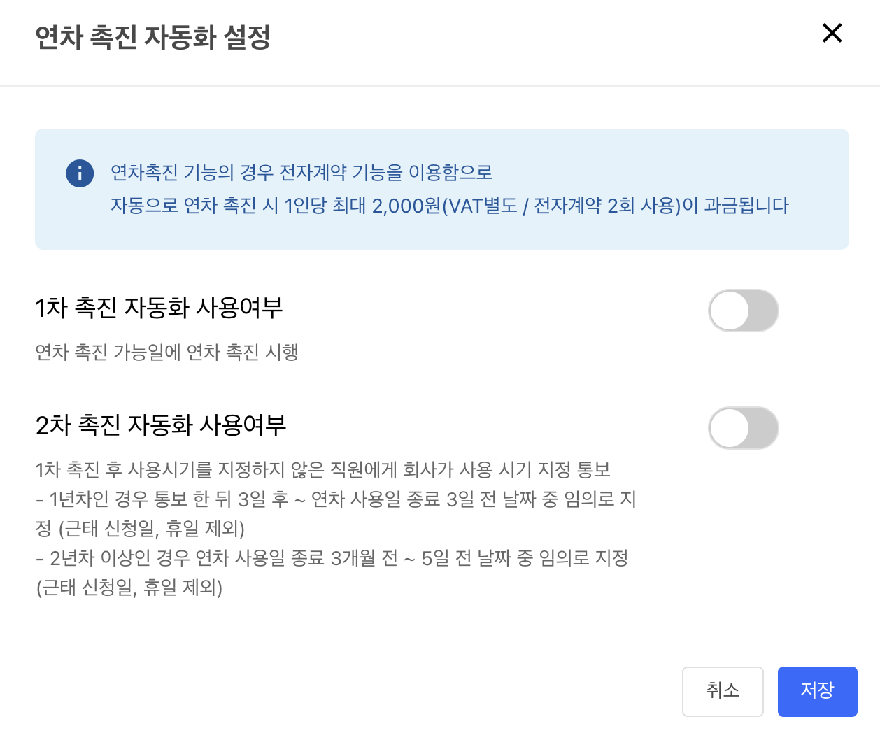 연차촉진 기능의 경우 전자계약 기능을 이용함으로 연차 촉진 시 1인당 최대 2,000원(VAT별도 / 전자계약 2회 사용)이 과금됩니다.