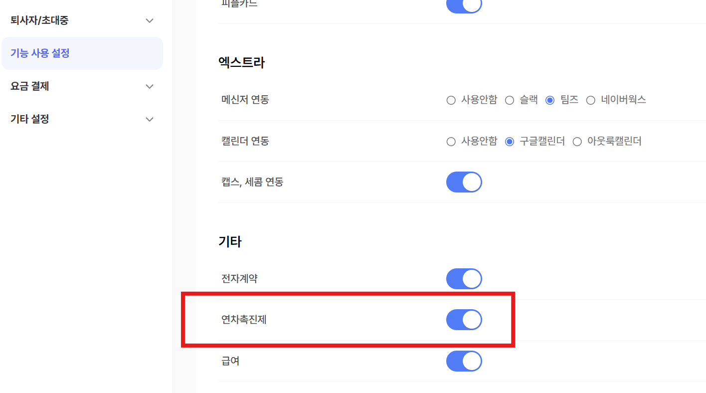 관리자 → 기능 사용 설정 → 기타 → 연차 촉진제 활성화