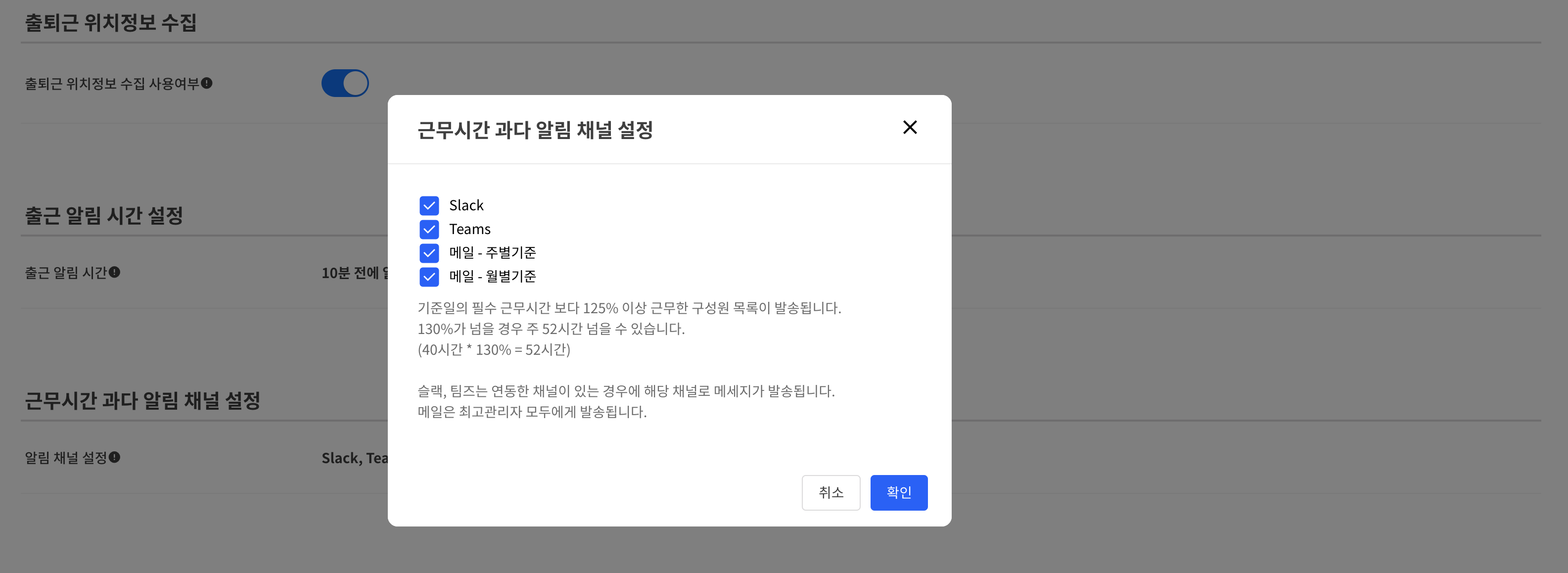 아래 링크로 이동하셔서 [근무시간 과다 알림 채널 설정]을 해주세요.