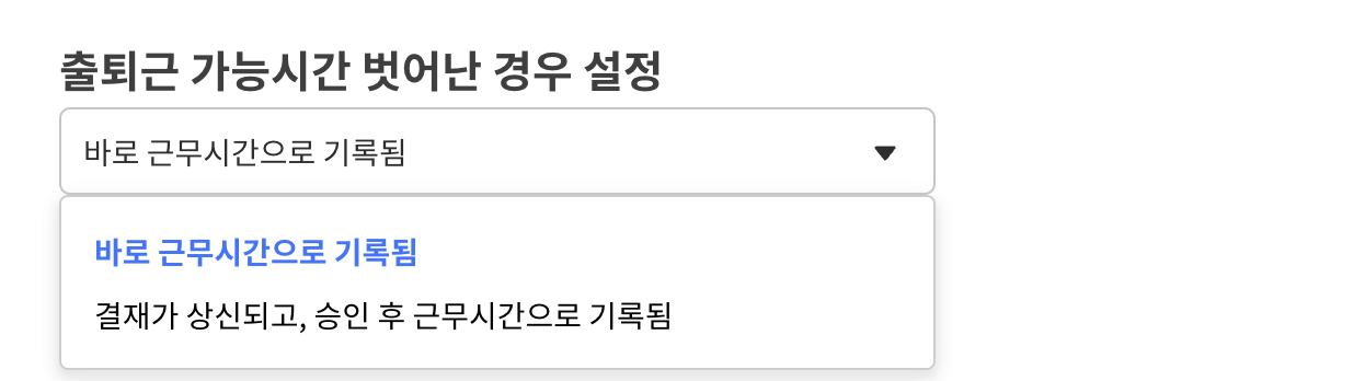 캡스&세콤 연동 시 출퇴근 가능 시간이 아닐 때, 구성원이 출퇴근을 할 경우 근무시간을 어떻게 처리할 지 옵션이 추가되었습니다.