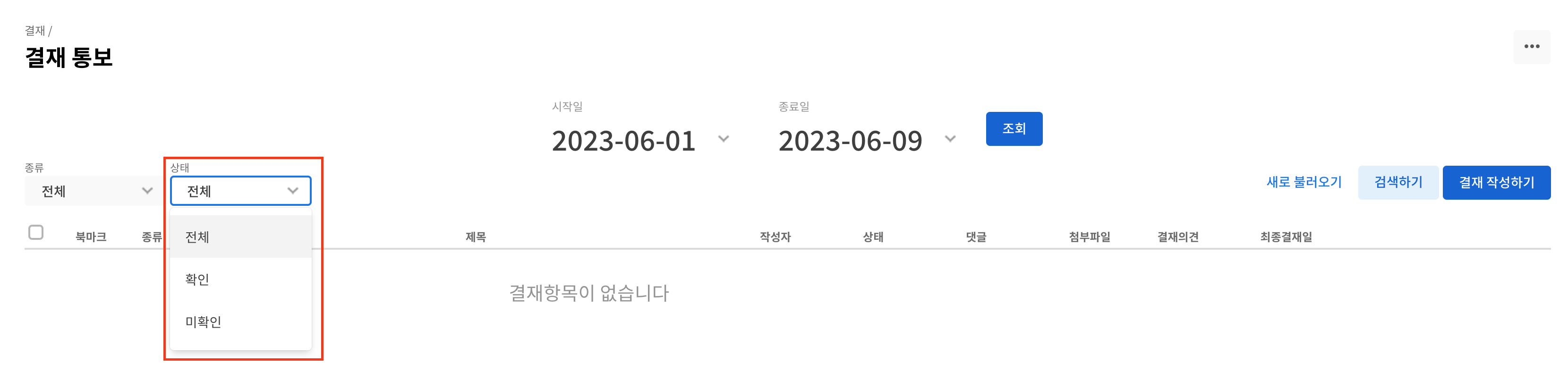 통보 받는 문서가 많은 인사팀&재무팀의 편의를 위해 통보 중 확인/미확인 필터가 추가되었습니다.