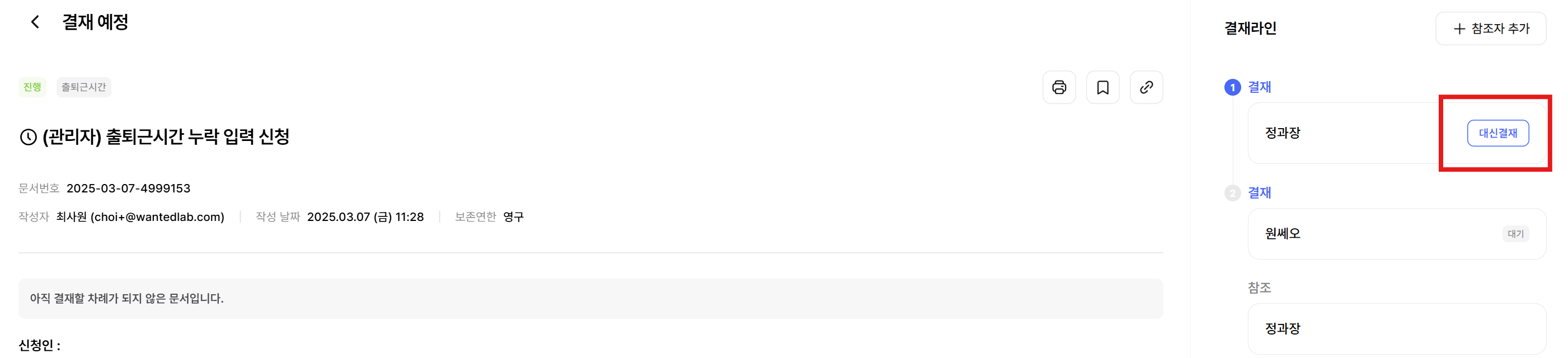 * 대신 결재는 관리자와는 상관없이, 후순위 결재자일 때 대신결재 버튼이 활성화됩니다.