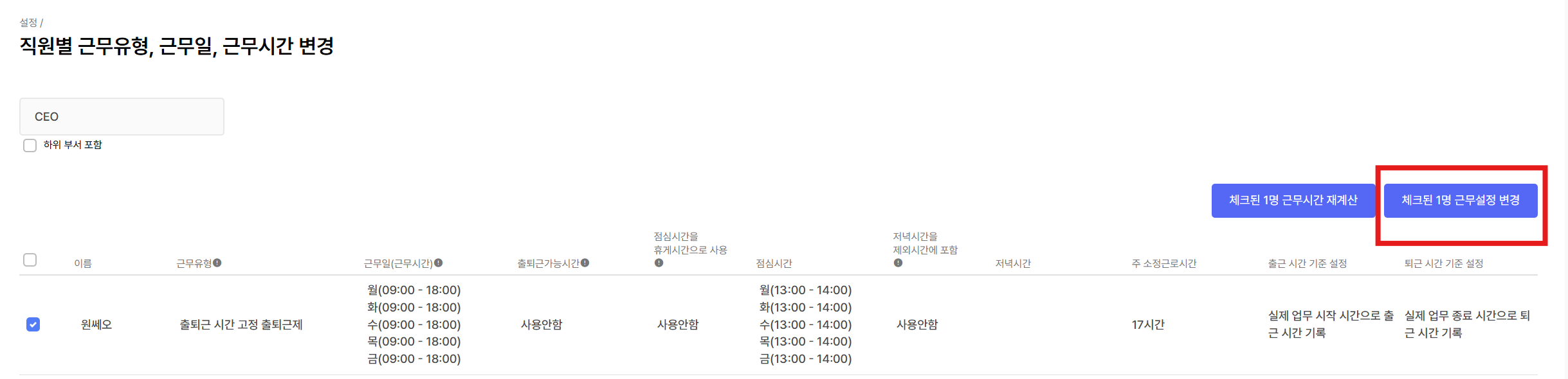 구성원을 선택하여 우측 [체크된 N명 근무설정 변경] 클릭