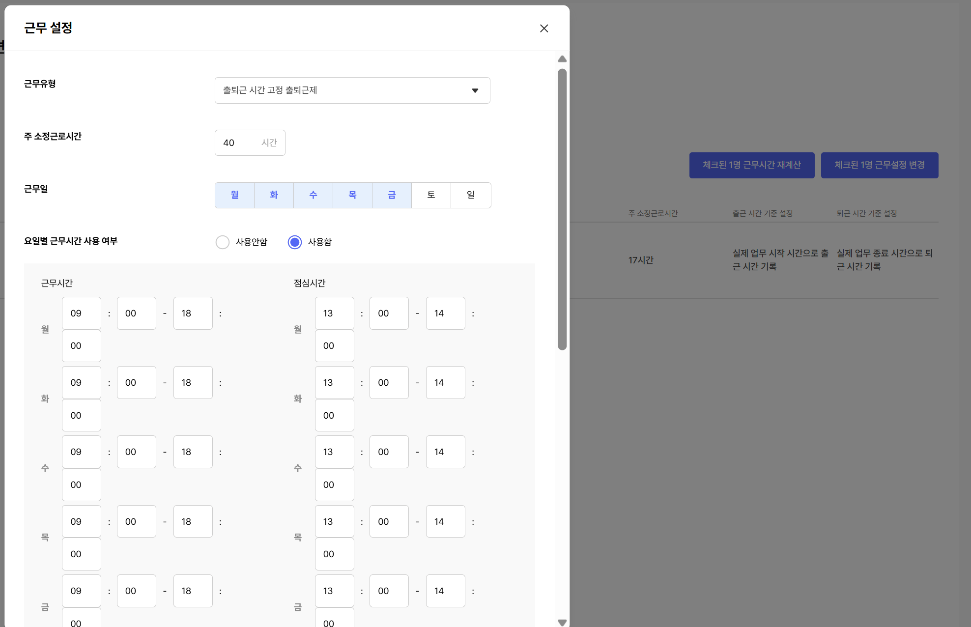 근무 설정 페이지에서 근무유형 설정 후, 하단의 [확인]을 눌러 저장